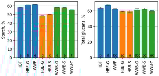 The content of starch and total glucans, % of dry weight of the flours (in blue): hull-less barley flour (HBF), germinated hull-less barley flour (HBF-G) and wholegrain wheat flour (WWF); of the hull-less barley breads (in orange): fermented with germinated hull-less barley sourdough (HBB-G); fermented with hull-less barley spontaneous sourdough (HBB-S); of the wholegrain wheat breads (in green): fermented with spontaneous hull-less barley sourdough (WWB-S); fermented with germinated hull-less barley sourdough (WWB-G); wholegrain wheat bread with yeast fermentation (WWB-Y). Each result represents mean ± standard deviation (n = 3). Values with the different letters are significantly different based on the Tukey’s HSD test.