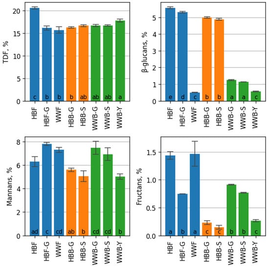 The highest content of fructans was found in wholegrain wheat flour (WWF)—1.47 ± 0.22% dw. It did not significantly differ from the content in hull-less barley flour—1.44 0.07% dw. Ispiryan and co-workers (2020) showed similar results of the content of fructans in wheat and barley flour []. The amount of fructans in barley grain can be 0.9–4.2% dw depending on the variety of barley and the growth environment [], and in different types of wheat it could be 0.7–2.9% dw []. In germinated hull-less barley flour (HB-G) the amount of fructans was 0.75
