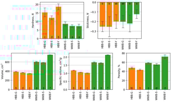 As a result of flour processing the complex of polysaccharides changes, and it influences the technological properties of bread. The results of crumb hardness, stickiness, volume, specific volume and porosity of breads are presented in Figure 3. The hardness of sourdough wheat bread WWB-S and WWB-G was 7.35 ± 0.75 N and 8.56 ± 1.13 N, respectively. The whole-grain wheat bread with yeast fermentation (WWB-Y) had the lowest hardness: 7.2 ± 1.09 N, however, it did not significantly differ from the hardness of wholegrain wheat bread WWB-S and WWB-G. Results show that germinated barley sourdough increased the hardness of the crumb of hull-less barley and wheat bread: HBB-G and WWB-G, and this fact corresponds to the researches done by other scientists [,]. Barley bread HBB-G, HBB-S and HBB-Y had a higher hardness compared to wheat breads WWB-G, WWB-S and WWB-Y. The lowest stickiness was observed in WWB-Y. In the samples of HBB-G, HBB-S and WWB-S, stickiness was not significantly different.