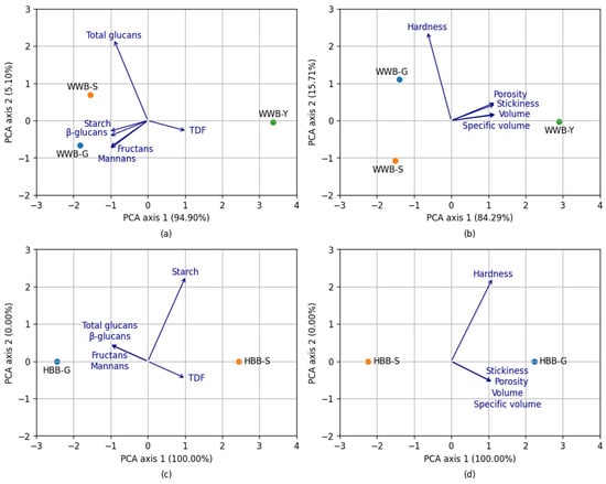 Principal component analysis (PCA) was performed to determine the relationship between the chemical parameters and physical parameters of WWB (Figure 5a,b) and HBB (Figure 5c,d). The relationships for all measured data were visualized in biplots. The samples of WWB-G were associated with a higher content of starch and non-starch polysaccharides separate from WWB-S, but WWB-Y—by a higher content of TDF. PCA axis 1 (Figure 5c) indicates that HBB-S was characterized by higher starch and TDF content, but HBB-G by higher total glucans and non-starch polysaccharides. In turn, the physical characteristics (Figure 5b) of wholegrain wheat breads were located in different zones of the plot. WWB-G was associated with a higher hardness (Figure 5d).