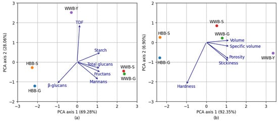 (a)—Principal component analysis (PCA) between chemical parameters (starch, total dietary fiber (TDF), total glucans (glucans), β-glucans, fructans, mannans) and hull-less barley bread (HBB-S; HBB-G) and wholegrain wheat bread (WWB-S; WWB-G; WWB-Y), (b)—PCA between physical parameters (volume, specific volume, hardness, stickiness, porosity) and hull-less barley bread (HBB-S; HBB-G) and wholegrain wheat bread (WWB-S; WWB-G; WWB-Y).