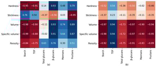 Correlation between chemical and physical characteristics of HBB (a) and WWB (b) breads.