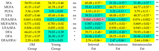 Heatmap plot of fatty acids profile of different fat types of the carcasses of bulls depending on slaughter ages. 1 DFA/OFA: hypocholesterolemic/hypercholesterolemic; *: p < 0.05; **: p < 0.01; ns: non-significant; a,b: Values in rows with different letters and colors differ sig.