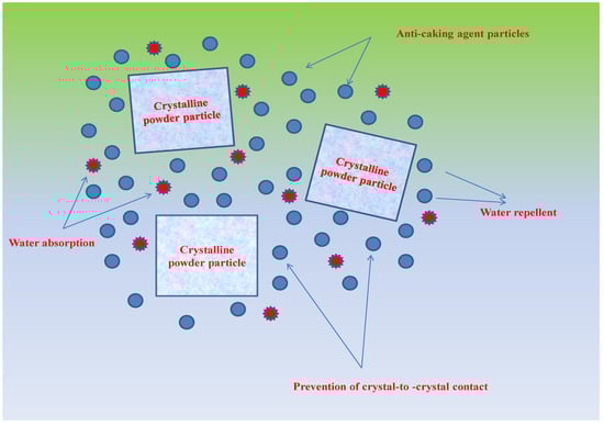 Mechanisms by which anticaking agents influence the water–solid interactions, preventing an increase in moisture gain.