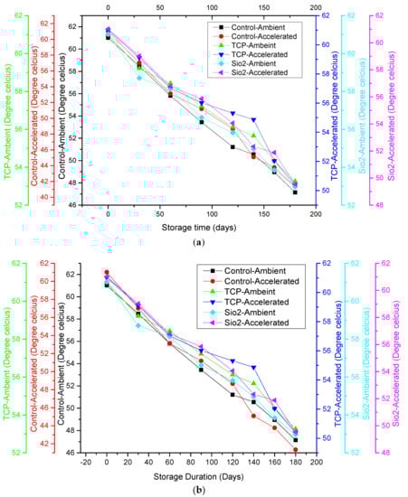 As shown in Figure 2, at the commencement of storage, the powder samples, both treated and control, had a Tg of 57.80 ± 2.10 °C and a Ts of 61.02 ± 1.21 °C. This is indicative of the existence of a stable amorphous structural configuration in all samples, as the values indicate the presence of a glassy state in the powder samples owing to the Tg and Ts values being much higher than room temperature. The results depict that both Tg and Ts decreased with storage period in all the samples under both storage conditions, with a more significant decrease observed under ambient than accelerated storage conditions. The decreasing tendency in the case of Tg and Ts values might be attributed to the plasticizing effect of water, since water has a lower Tg value of −135 °C, which may have resulted in the decline in the amorphous material’s Tg during storage (Figure 2a,b) [8]. Furthermore, the consequential effect of moisture accumulation also caused enhanced molecule mobilization, exhibiting a greater tendency to undergo physical transition. Similarly, it was also reported by Fabra et al. [8] that the Tg and Ts for tomato and grapefruit powders also exhibited stepwise declining tendencies in a gradual manner as function of storage time.