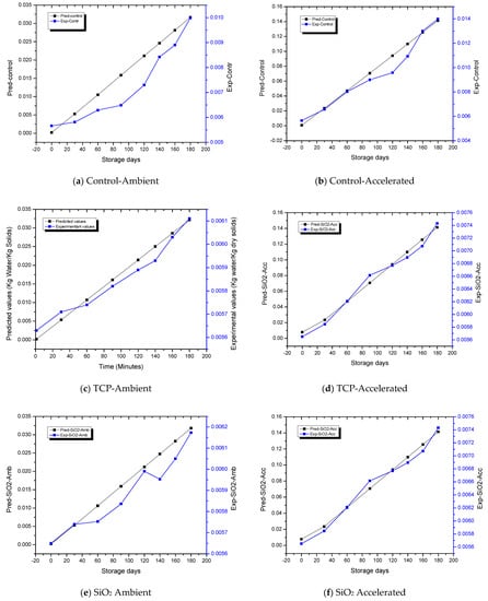 Under both the ambient and accelerated storage conditions for control and treated ALP packaged samples, the initial value of water activity utilized was 0.28. Saturation vapor pressure of water at 25 °C (ambient) and 40 °C (accelerated) were acquired from steam-table data with p* as 3173.027 Pa at 25 °C and 7380.726 Pa at 40 °C, respectively. Storage-environment RH was taken as 0.60 (60%) for ambient and 0.90 (90%) for accelerated storage conditions, respectively. The pouch surface area was represented as Ap = 2 × 0.155 × 0.193 = 0.0600 m2, pouch water vapor permeability as K = 5.4 × 10−8 kg/m2/day/Pa, and dry solids amount present in 20 g of powder as Ws = 0.02 (1 − 0.004) = 0.0192 kg. Equation (4) elucidates the graphical relationship (Figure 3) between storage time and moisture content of apricot powder (kg water/kg dry apricot solids). Figure 3 also depicts the variation of experimental moisture content as a function of storage time. The predicted time required for moisture content of control samples subjected to ambient and accelerated conditions to rise from an initial value of Xi = 0.004 kg H2O/kg dry solids to the critical safe moisture content of powder value Xc, taken as 0.006 kg H2O/kg dry solids, was 40 and 8 days, respectively, whereas the experimental time interval required for the moisture-content increase in powder was 45 and 16 days, respectively (Figure 3a,b). The predicted shelf life of TCP-treated samples under ambient and accelerated storage conditions was 157 and 77 days, respectively, whereas, the experimental time required for this increase in moisture content in powder was approximately 150 and 75 days, respectively (Figure 3c,d). Similarly, from Figure 3e,f, the predicted shelf life of SiO2-treated samples under ambient and accelerated storage conditions was 137 and 39 days, respectively, whereas the experimental time required for this moisture-content increase in the powder was 148 and 47 days, respectively. The predicted shelf life obtained from the GAB model and the experimental shelf life were very similar. The predicted and experimental moisture content exhibited a correlation coefficient of 0.981, indicating that the GAB model (Equation (4)) was adequate for predicting the shelf life of SDAP. The moisture gain had significant influence as a critical determinant of shelf life and quality of low-moisture food products. It has also been reported that quality deterioration usually increases dramatically when moisture content or aw reached above certain levels and the time requirement for reaching to critical moisture content has been implied as an indicator of shelf life. The moisture-transfer rate and the extent in low-moisture foods packaged in plastic films may be subjected to variability depending on the aw of food, storage conditions including humidity and temperature, and package permeability to water vapor.