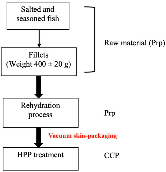 Safe and ready-to-cook food matrices have been largely required by modern consumers [1]. For this reason, fish industries that produce salted cod or salt-cured fish have developed industrially rehydrated products (soaking process) which are classified as ready-to-cook foodstuffs [2]. In this way, producers have satisfied consumers’ requests and have avoided the organoleptic and microbiological substantial changes in the muscle tissue due to the wrongly managed rehydration process in the home. Indeed, the rehydration process is a crucial step in which salted products increase in water content to 70–85% and reduce salt to 2–3% providing a perfect microenvironment for bacterial multiplication [2,3,4]. The abovementioned products present a limited shelf life due to the high total bacterial count of more than 6 log10 cfu/g (stored at refrigerated temperatures of 1–4 °C for 6 days) with organoleptic alterations registered at days 7–10 from rehydration. This condition is justified by the increasing values of water parameter activities which achieve levels at which substantial microbial multiplication can be determined [3].