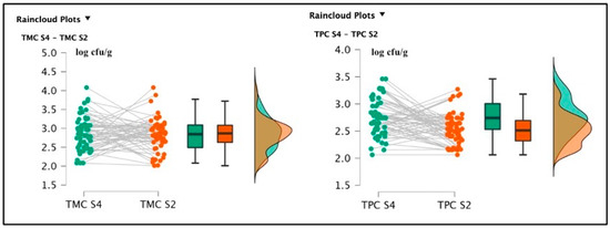 The S4 samples showed a TMC average value of 2.86 ± 0.44 log cfu/g and a TPC average value of 2.75 ± 0.33 log cfu/g. S2 registered the following bacterial loads: TMC 2.80 ± 0.43 log cfu/g and TPC 2.52 ± 0.28 log cfu/g. The t-test conducted on the TMC S4 and S2 did not reveal a significant difference regarding the comparison of mesophilic counts [t(59) = 0.454; p = 0.651; Cohen’s d = 0.059] and the null hypothesis was accepted (TMC S4 = TMC S2); however, the difference between TPC S4 and TPC S2 values results were significant [t(59) = 4.133; p < 0.001; Cohen’s d = 0.534] (See Figure 2).