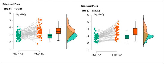 Raincloud plots representing TMC value distributions from differently salted to rehydrated products. For each graphic, the vertical axes report the calculated bacterial loads, and the horizontal axes indicate the screened TMC values from S4–R4 (on the left) and S2–R2 (on the right) analyzed food matrices.