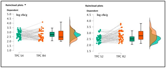 Raincloud plots representing TPC value distributions from differently salted to rehydrated products. For each graphic, the vertical axes report the calculated bacterial loads, and the horizontal axes indicate the screened TPC values from S4–R4 (on the left) and S2–R2 (on the right) analyzed food matrices.
