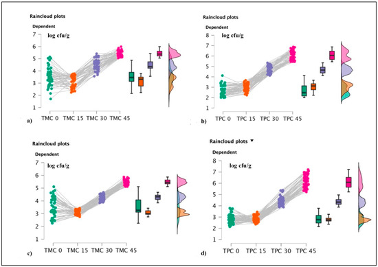 Raincloud plots representing. For each graphic, the vertical axis reports the calculated bacterial loads, and the horizontal axis indicates TMC and TPC values during the shelf life evaluations. More in detail, (a) TMC values for OTR1; (b) TPC for OTR1; (c) TMC for OTR2; and (d) TPC for OTR2.