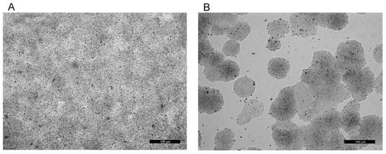Native micrographs of differentiated (LG, non-proliferating (A)) and non-differentiated (HG, proliferating (B)) human colorectal adenocarcinoma HT29 cells. Bars = 500 µm.