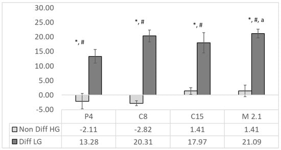 ALP activity (%) in supernatants from C15, M2.1, P4 C8 strains of Lacticaseibacillus paracasei in non-differentiated (in light grey) and differentiated (in dark grey) human colorectal adenocarcinoma HT29 cells. The ALP activity is calculated as a % of the MRS (n = 4, ±SEM), significance: to the relative MRS control LG/HG for non-differentiated and differentiated cells, respectively—p < 0.001 = *; non-differentiated vs. differentiated p < 0.001 = #; and differentiated P4 to M2.1 to p < 0.05 = a.