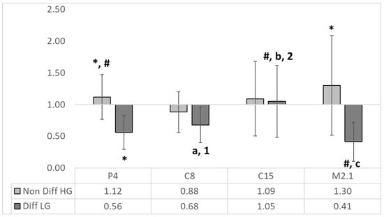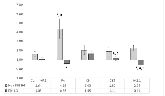 The relative expression of IAP to the MRS HG/LG control (n = 4, ±SEM). The established significant differences (p < 0.05) are expressed as follows: *—significance to the reciprocal MRS HG/LG control; # significance between groups; the significance in differentiated (LG) group is expressed as follows: with small letters between P4 and C8 (a), C15 (b) and M2.1 (c); with numbers between M2.1 and C8 (1) and C15 (2).