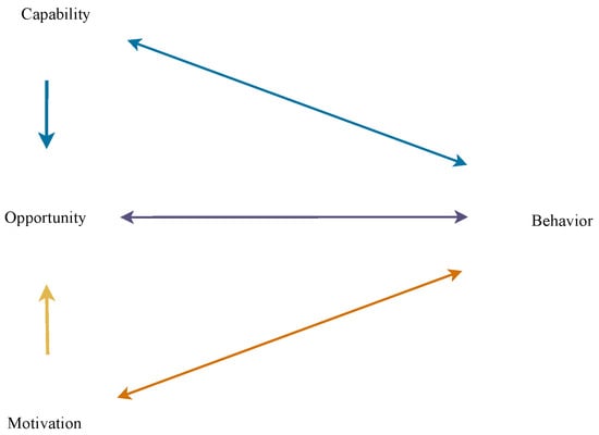 According to the model, (i) capabilities can be physical or psychological and are related to the knowledge and skills needed to engage in a specific behavior. An (ii) opportunity, in turn, is represented by social or environmental factors that are outside the individual and drive behavior. Finally, (iii) motivation represents the mental processes (reflective or automatic) that drive behaviors [24].
