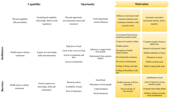 The facilitators and barriers for reducing meat consumption in Brazil identified in the study were classified as (i) physical capability, (ii) psychological capability, (iii) physical opportunity, (iv) social opportunity, (v) reflexive motivation, and (vi) automatic motivation.