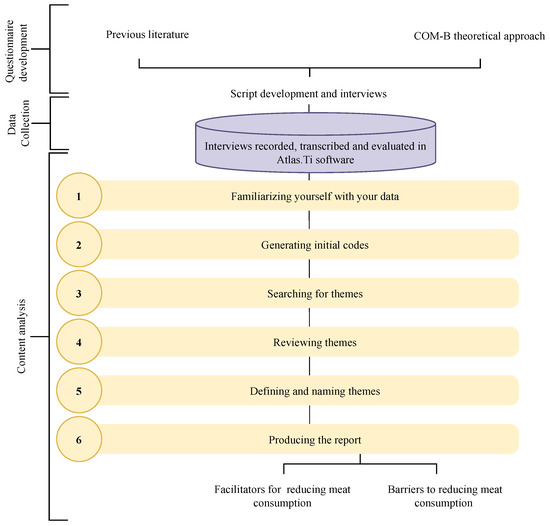 The collected content was subjected to content analysis in six steps to identify patterns [32], as detailed in Figure 3. The (i) first phase involved prior reading for recognition and familiarization with the data, thus allowing an (ii) inductive coding in the second phase. In phase three, the (iii) generated codes were grouped based on similarity and previous literature. In phase four, (iv) facilitators or barriers mentioned by fewer than three participants were disregarded. In this phase, a new deductive coding was also used to classify the facilitators and barriers identified in broader themes according to the COM-B Model, Capabilities, Opportunities and Motivations. In phase five, the (v) definitive naming of the themes and the removal of extracts from the interviews that exemplified each identified theme was carried out. The last phase involved the (vi) drafting of the report. In order to enable a better understanding, the results were stratified based on patterns related to potential facilitators and barriers of capability, opportunity, and motivation to reduce meat consumption in Brazil.
