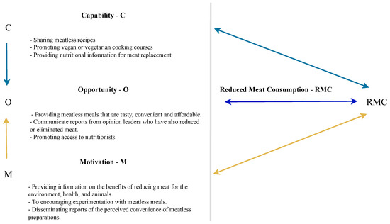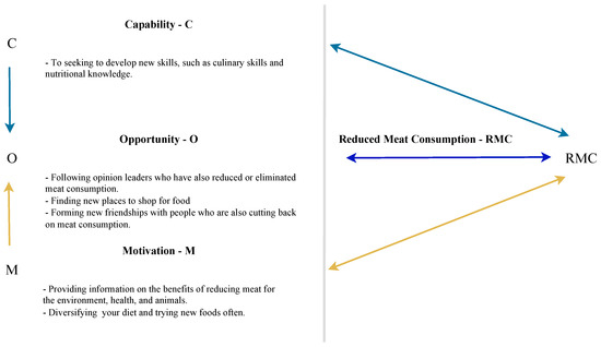 This is a qualitative and in-depth study using semi-structured interviews. In this respect, it is also relevant to show that the current research is part of a (recent) line of qualitative studies in meat reduction and meat substitutes (see, e.g., [26,27,28,29,30]). In this context, the COM-B Model [24] was used to analyze consumer behavior. The applied model presents the behavior generated by interactions between (i) capabilities, (ii) opportunities, and (iii) motivations (see Figure 1).