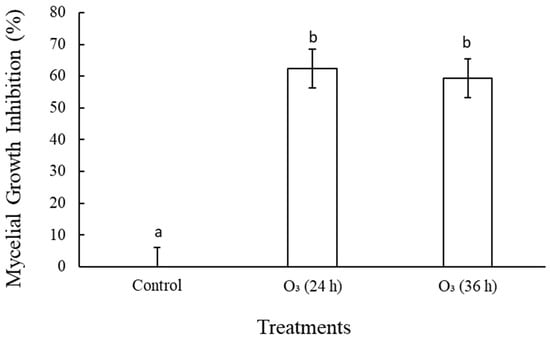 Effect of gaseous ozone (0.25 mg/L) on mycelial growth inhibition (%) of L. theobromae incubated at 10 °C for fourteen days and seven days at 25 °C (p < 0.05; least significance difference = 12.27; n = 9). Bars with the same letter are not significantly different (p < 0.05).