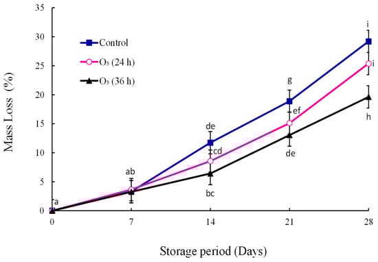 On day twenty-one, the treatment means of the control and O3 (24 h) were not significantly different. At the end of storage, fruit treated with O3 36 h (19.63%) had lower mass loss than those subjected to O3 24 h (25.39%) and the control treatment (29.20%).