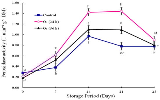 The POD activity increased from day zero until day fourteen, and then decreased until the end of the storage period in all treatments (Figure 3). The POD activity of O3 (24 h) was significantly (p < 0.05) higher than that of other treatments from day fourteen till the end of the storage period.