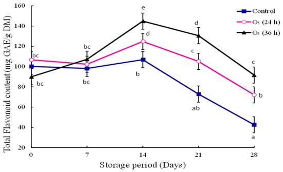 The total flavonoid content followed a similar trend to POD activity (Figure 4). On day fourteen, the highest flavonoid content was observed in O3 36 h (144.49 mg GAE/g DM). The flavonoid content of fruit treated with O3 (36 h) was higher than in those subjected to other treatments from day fourteen until the end of the storage time. Untreated fruit had low flavonoid content compared to O3 (24 h) at the end of the storage time.