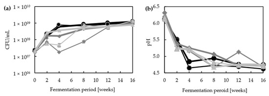 In the same way as the cell counts, the pH values were similar at the beginning of the fermentation (approx. 6.2) and also after 16 weeks (approx. 4.7). During the first four weeks, the fermentation without wheat and buckwheat showed a fast decrease below a pH of 5. For the batches with wheat and buckwheat, these low pH values were firstly detected after eight to 12 weeks. The decrease in the pH matched with the appearance of T. halophilus, since it appeared in ML1 and ML2 after four weeks and was detected for the first time in batches with wheat and buckwheat after eight weeks (Figure 2).