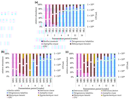 The microbial cell counts and pH values changed during the fermentation and differed between the different batches (Figure 1). They all started with 1.7–2.4 × 107 CFU/mL and reached 1.4–8.0 × 109 CFU/mL after 16 weeks of incubation. Within the first four weeks in the fermentation with lupine seeds as sole substrate, the abundance of microorganisms increased with an average recorded growth rate of 7.4 per week for batch ML1 and of 8.2 per week for ML2. Subsequently, the stationary growth phase was reached. With additional carbohydrate sources, similar growth rates were detected within the first two weeks. However, after four weeks of incubation, cell counts were lower in these batches compared to the control group which correlates with the presence of Z. rouxii (Figure 2). Interestingly, they all reached cell counts of similar CFU/mL after 16 weeks.