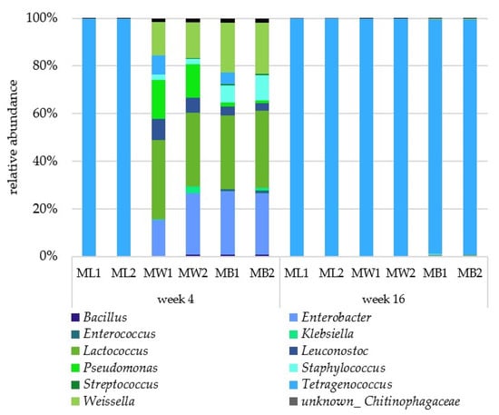 The 16S rDNA amplicon sequencing revealed the presence of other bacterial genera in carbohydrate-supplemented moromi after four weeks of incubation (Figure 3). Besides Tetragenococcus, the most abundant organisms detected were Enterobacter (highest sequence similarity with E. hormaechei, and E. cloacae), Lactococcus (lactis, taiwanensis), Leuconostoc (holzapfelii, falkenbergense), Pseudomonas (juntendi/putida), Staphylococcus (warneri, aureus, caprae), and Weissella (confusa, paramesenterioudes). It is probable that these were not detected via MALDI-TOF-MS due to the detection limit for the cultivation method (<102 CFU/mL) or due to poor growth in media used in this study. In the same way as the culture-dependent method, 16S rDNA amplicon sequence analysis revealed Tetragenococcus as the only bacterium present at the end of the fermentation in all batches.