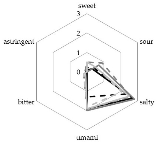 For a description of the flavour, a sensory analysis of the resulting seasoning sauces was performed. Since the sensory data of the biological replicates differ from each other (Figure S1 (Supplementary Materials)), they will be described separately. The taste was described using the six attributes of sweet, umami, bitter, astringent, salty, and sour (Figure 4) with intensities of 0 (not perceptible) to 4 (very strong).