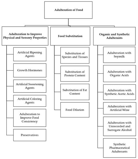 Figure 1 presents the key forms of intentional food adulteration, which are briefly discussed in the following sections [3,4,5].