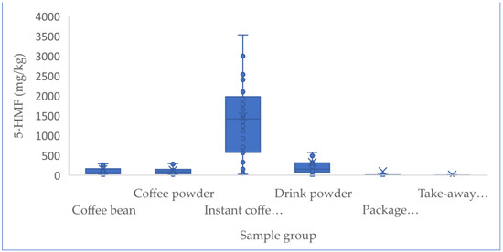 Box plots comparing 5-HMF concentrations in 6 coffee products in 2021. Lower and upper ends of the box represent the lower and upper quartiles (25th and 75th percentiles), the middle line represents the median, and the whiskers represent the minimum and maximum, excluding outliers.