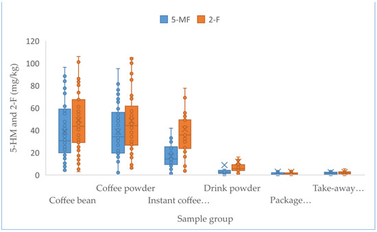 Box plots comparing 5-MF and 2-F concentrations in 6 coffee products in 2021. Lower and upper ends of the box represent the lower and upper quartiles (25th and 75th percentiles), the middle line represents the median, and the whiskers represent the minimum and maximum, excluding outliers.
