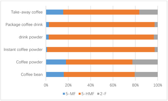 Up to 449 samples from the Chinese market were studied, including 67 coffee beans, 42 coffee powder products, 34 instant coffee powders, 122 drink powders, 72 packaged coffee drinks, and 112 take-out coffee products. Table 3 describes the sample results of the above analyzed factors, such as the coffee sample number and the concentrations of furfural and its derivatives. Statistical analysis revealed that the concentrations of furfural and its derivatives in coffee beans (7.3–897.0 mg/kg for 5-HMF, 3.5–96.3 mg/kg for 5-MF, 3.0–219.0 mg/kg for 2-F), coffee powder (9.1–651.0 mg/kg for 5-HMF, 1.9–95.1 mg/kg for 5-MF, 5.8–122 mg/kg for 2-F), and instant coffee powder (23.7–5062 mg/kg for 5-HMF, ND-418 mg/kg for 5-MF, 3.3–172 mg/kg for 2-F) were significantly higher than others (adjusted p < 0.005), followed by the drink powder (ND-3675.0 mg/kg for 5-HMF, ND-151.0 mg/kg for 5-MF, 1.3–99.0 mg/kg for 2-F). No obvious difference (adjusted p > 0.05) existed between the levels of furfural and its derivatives in packaged coffee drinks and takeaway coffee, which both had nearly 4–20-fold lower content relative to those observed in the above coffee samples (adjusted p < 0.005), likely due to the added water during processing. The concentrations of 5-HMF in instant coffee powder products ranged from 23.7 to 5062 mg/kg, and were obviously higher (adjusted p < 0.005) compared to those in coffee beans and ground coffee powder products. In contrast, the concentrations of 5-MF and 2-F in three coffee products were not obviously different (adjusted p > 0.05). No obvious statistical differences in furfural and its derivatives existed among coffee beans and ground coffee powder products, which might be due to the fact that they only involve the physical shredding of coffee beans into coffee powder and thus result in no change in the furfural content. Figure 1 and Figure 2 show the concentrations of furfural and its derivatives in a box plot. The proportions of 5-MF, 5-HMF, and 2-F in relation to the sum of furfural and its derivatives were calculated based on the mean values of all the 449 tested coffee products (Figure 3). Here, 5-HMF was found as the predominant component in all six types of coffee products. In general, the levels of furfural and its derivatives found in this study are substantially lower than those reported in other studies, in which the reported concentrations in roasted coffee ranged from 300 to 2900 mg/kg [30]. For a total of 20 medium roasted coffees in Turkey, the 5-HMF levels ranged from 168.9 to 353.5 mg/kg, with an average value of 260.5 mg/kg [31]. The range of 5-HMF in 108 coffee samples was 51-1143 mg/kg in Korea [22].