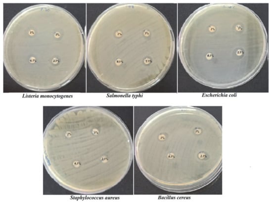 In evaluating the antibacterial effect, C. bergamia EO was prepared in various concentrations, such as 0.5 µg/mL, 1 µg/mL, 2.5 µg/mL and 5 µg/mL, against E. coli, L. monocytogenes, B. cereus, S. typhimurium and S. aureus by the disc diffusion method. The results shown in Table 1 indicate that the bacterial strains expressed a varied range of susceptibilities to the actions of C. bergamia EOs (Figure 1).