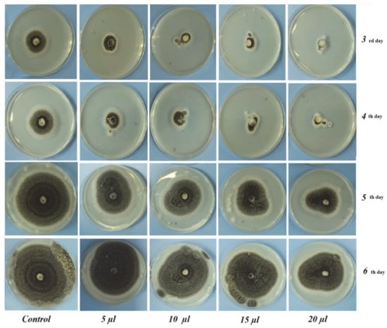 In the 6 days of incubation of A. niger, inhibition rates of 78.00 ± 0.00 mm at a 5 µL dose, 77.00 ± 2.82 mm at a 10 µL dose, 75.00 ± 0.00 mm at a 15 µL dose and 67.25 ± 0.35 mm at a 20 µL dose and 90.00 ± 0.00 mm growth of control were observed. In the 6 incubation days of P. expansum, inhibition rates of 32.00 ± 2.82 mm at 5 µL dose, 31.50 ± 0.00 mm at 10 µL dose, 27.00 ± 0.00 mm at 15 µL dose and 26.16 ±0.76 mm at 20 µL dose and 45.50 ± 2.12 mm of control fungi were observed. A higher antifungal effect on the part of C. bergamia EO was obtained against P. expansum. The experimental results suggested that increasing the doses (5, 10, 15, 20 μL/petri) of C. bergamia EO resulted in weaker growth of both A. niger and P. expansum (Figure 2 and Figure 3).