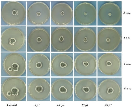 The disk evaporation method was used to determine the antifungal activity of C. bergamia EO against A. niger and P. expansum. Fungal plugs from a 7-day old, actively growing, culture, 6 mm in diameter, were inoculated into petri dishes containing 20 mL of fresh Potato Dextrose Agar (PDA) medium. Diluted essential oils, ranging from 5 to 20 µL/petri, were then adsorbed onto blank antimicrobial disks. The disks were placed on the petri dishes by inverting the petri dishes. Sterile distilled water was used as a control. The petri dishes were covered with parafilm immediately after the addition of the essential oil to allow effective exposure of the vapors to the fungal mycelia, followed by incubation at 27 °C for 7 days. This assay per test pathogen was triplicated to arrive at a statistically sound conclusion [,,].