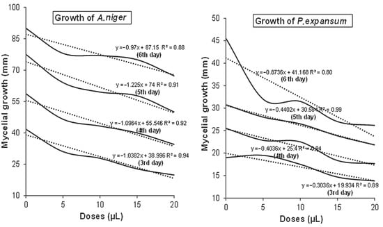 Plots of the dose (µL) of C. bergamia EO versus in vitro mycelial growth (mm) of A. niger and P. expansum, respectively (obtained by linear regression), showing a negative linear polynomial relationship between mycelial growth and doses, along with linear equations and R2 values.