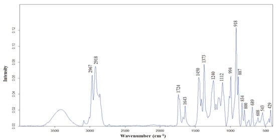 The ATR-FTIR spectrum of C. bergamia EO essential oil at the spectral range of 4000–400 cm−1 is presented in Figure 5. The major bands were observed at 2967, 2918, 1724, 1643, 1450, 1373, 1240, 1112, 994, 918, 887, 834 and 800 cm−1. In the previous studies, the FTIR band assignments, of a citrus species lemon essential oil, were presented []. Common FTIR bands were observed in the FTIR spectrum of C. bergamia EO. The band, with a peak point at 2967 cm−1, corresponded to –CH3 asymmetric and symmetric stretching vibrations []. The bands at 2918, 1724, 1643 cm−1 were due to the C–H stretching vibrations, the C=O stretching vibrations of ester groups, and ν(–C=C–, cis-) and δ(–OH) vibrations, respectively []. The band at 1450 cm−1 might be related to the bending vibrations of CH2 and CH3 of aliphatic groups []. The significant peaks at 1376 cm−1 and 887 cm−1 arose from C-H bending vibrations and (–HC = CH–, trans-) bending vibrations, respectively [,]. The significant bands at 994 and 918 cm−1 were probably due to δ(–HC=CH–, trans-) bending vibrations []. Lastly, the bands at 834 and 800 cm−1 corresponded to C–H stretching vibrations and C=C bending vibrations, respectively [,].