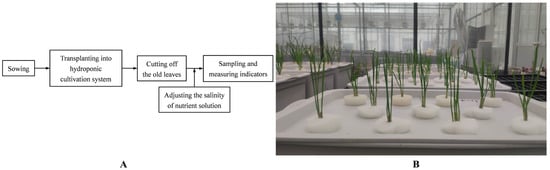 When the height of the seedings reached 30 cm (8 June 2021), we cut off the old leaves of the plant to grow new leaves. At the same time, the hydroponic Chinese chives were randomly divided into 5 groups, each group having 5 rectangular hydroponic boxes. The cover of hydroponic box had 11 holes, and 4 seedings were fixed in every hole. The salinity of the nutrient solution was regulated by adding NaCl to the nutrient solution to the following concentration: 0 mM, 5 mM, 10 mM, 20 mM and 30 mM. Other management of the nutrient solution was the same as the above description. On 8 August 2021, healthy Chinese chive leaves of the same size were selected for sampling from each treatment, and each treatment was repeated three times. All samples were ground into powder in liquid nitrogen and stored at −80 °C until analysis. The overall flowchart of the experiment and the hydroponic system are shown in Figure 1.
