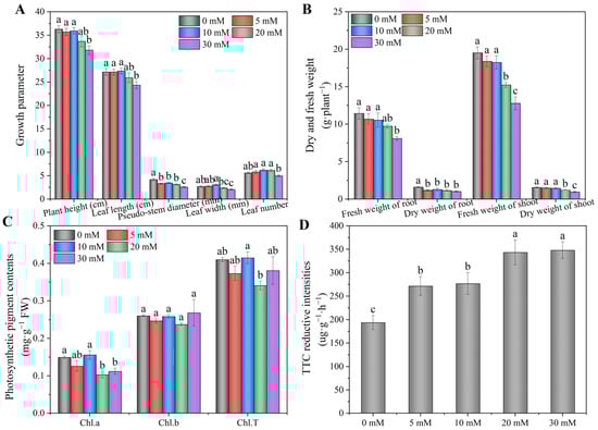 During harvest, 30 seedings were selected for each treatment to measure the plant height, leaf length and pseudo-stem diameter, and leaf width with a tape measure and vernier caliper, respectively. After harvest, the shoots and roots of the Chinese chives were dried at 105 °C for 30 min, and then at 75 °C to a constant weight for recording fresh weight and dry weight []. Root activity was determined using the triphenyl tetrazolium chloride (TTC) method [] with slight modifications. Briefly, 0.5 g of fresh root tips were cut into 1 cm segments and placed in test tubes containing 5 mL of 1% TTC and 5 mL of 100 mM phosphate buffer (pH 7.5). After holding at 37 °C for 1h, the reaction was terminated by adding 2 mL of 1 M H2SO4. Subsequently, the roots were transferred to a mortar containing 3–5 mL of ethyl acetate (compared with methanol, ethyl acetate has low toxicity, so ethyl acetate was used instead) and a small amount of quartz sand. The grinding homogenate was filtered to the graduated test tube, and the residue was washed 2–3 times with a small amount of ethyl acetate. Finally, the volume of ethyl acetate was fixed at 10 mL, and then the absorbance values were performed with a UV-1780 spectrophotometer at 485 nm.