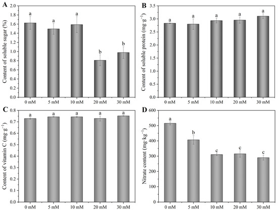 Compared with 0 mM treatment, 5 and 10 mM NaCl treatments had no significant effect on the soluble sugar content; however, 20 and 30 mM NaCl significantly decreased the soluble sugar content by 50 and 40%, respectively (Figure 3A). With the increase in NaCl concentration, the content of soluble protein and vitamin C presented an uptrend as a whole, and increased by 9.6 and 3.2% from 0 to 30 mM NaCl, respectively (Figure 3B,C). Moreover, when treated with 5–30 mM NaCl, the nitrate content significantly decreased by 21, 40, 39 and 44%, respectively (Figure 3D).