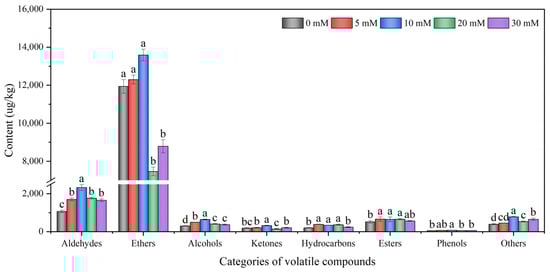 As shown in Figure 4 and Table 1, the contents of various volatile compounds in different treatments of Chinese chive had great differences. Ethers (7465.47–13,585.64 μg/kg) were the most abundant of all compounds, followed by aldehydes (1065.56–2324.82 μg/kg). The phenols content (56.04–75.57 μg/kg) was the lowest, and furans (14.59–140.52 μg/kg) were only detected in the 5 and 10 mM treatment. Compared with 0 mM NaCl treatment, 5–30 mM NaCl significantly promoted the content of aldehydes, especially the 10 mM NaCl treatment, which increased by 118%. However, when the concentration of NaCl exceeded 10 mM, the content of ethers significantly decreased. The 10 mM NaCl treatment significantly promoted the content of alcohols and ketones, and the 5–20 mM NaCl treatment significantly promoted the content of hydrocarbons.