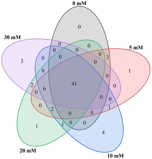 The Venn diagram shows common and specific volatile compounds among different treatments of hydroponic Chinese chive (Figure 5). A total of 41 volatile compounds were common substances among the five treatments. The 41 common compounds comprised 11 aldehydes, 13 ethers, 4 alcohols, 2 ketones, 1 hydrocarbon, 6 esters, 2 phenols and 2 other compounds. Treatment with 5, 10, 20 and 30 mM NaCl produced one, four, one and three specific compounds, respectively. The one specific compound produced by 5 and 20 mM NaCl treatment was 2,3-dihydrofuran and 7-tetradecyne, respectively. The four special compounds produced by 10 mM NaCl treatment were methyl propyl disulfide, (Z)-2-penten-1-ol, 1-hexadecanol and 2-pentylfuran, of which the content of 1-hexadecanol was the highest, reaching 45.54 μg/kg. Treatment with 30 mM NaCl produced three specific compounds: cis-4-Isopropenyl-1-methylcyclohexanol, 2,3,4-trimethyl-2-cyclopenten-1-one and 2-methyl-2-phenyl oxirane. Of these, cis-4-Isopropenyl-1-methylcyclohexanol was the most abundant, reaching 56.41 μg/kg.