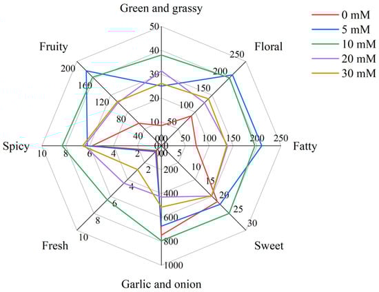 In general, volatile compounds with OAVs > 1 have an actual contribution to the overall flavor, that is, major aroma-active compounds. As shown in Table 2, there were only 14 volatile compounds with OAVs > 1, mainly aldehydes and ethers, but also ketones, phenols and furan. Moreover, the compounds with OAVs < 1 also have a certain effect on the overall flavor. According to the odor description, the aroma of volatile compounds in Chinese chive can be divided into eight categories, including “green and grassy”, “floral”, “fatty”, “sweet”, “garlic and onion”, “fresh”, “spicy” and “fruity” (Figure 6). The “garlic and onion” odor was the strongest scent, which mainly derived from ethers. Dimethyl disulfide, dimethyl trisulfide and diallyl disulfide are three major aroma-active compounds in ethers. Due to the lower threshold (6 μg/kg) and high concentration of dimethyl trisulfide, it contributed greatly to the “garlic and onion” odor. Among these treatments, the 10 mM NaCl treatment had a stronger “garlic and onion” odor than other treatments because it promoted the production of more ethers.