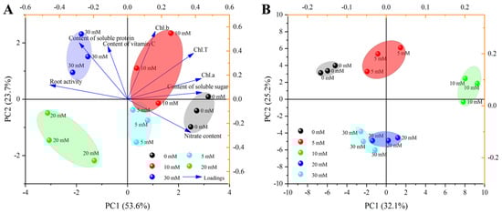 The principal component analysis (PCA) of growth and quality parameters, as well as the 75 volatile compounds in this study, are shown in Figure 7. The sum of the first two principal components of growth and quality parameters reached 77.3%, of which PC1 and PC2 accounted for 53.6% and 23.7% of the total variance, respectively (Figure 7A). The first principal component sorted the treatments into two groups: 0, 5, and 10 mM were close to one group, while 20 and 30 mM were close to one group. It could be observed that the soluble sugar and Chl.b showed strong loadings with the first and second principal component, respectively. The root activity was highly negative to PC1, and nitrate was highly negative to PC2. The sum of the first two principal components of the 75 volatile compounds reached 57.3%, of which PC1 and PC2 accounted for 32.1% and 25.2% of the total variance, respectively (Figure 7B). The second principal component sorted the treatments into two groups: 0, 5, and 10 mM were close to one group, while 20 and 30 mM were close to one group, which was consistent with the results of growth and quality parameters.
