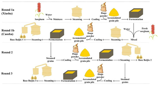 Baijiu is one of the national alcoholic beverages with a history of thousands of years and one of the six world-famous distilled beverages with alcohol contents from 35–60% [1]. In 2020, the production of Baijiu reached 7.4 million kiloliters, and the sales amount exceeded 580 billion yuan. Thus Baijiu is usually recognized as an important component of the Chinese food industry. The manufacturing of Chinese Baijiu mainly includes a microbial fermentation system involving hundreds of species [1]. Baijiu brewing uses an open fermentation system, and microbes from the environment, operators, tools, water, raw materials, pits, and Daqu all participate in the fermentation process [2]. Due to the divergence of microbial ecology and varied manufacturing processes, the microbial compositions and the flavors of Baijiu products significantly diverge in different regions of China [3]. According to flavors, Chinese Baijiu is mainly divided into 12 kinds, including strong-flavor Baijiu, sauce-flavor Baijiu, light-flavor Baijiu, rice-flavor Baijiu, sesame-flavor Baijiu, laobaigan-flavor Baijiu, fuyu-flavor Baijiu, herbal-flavor Baijiu, chi-flavor Baijiu, te-flavor Baijiu, mixed-flavor Baijiu and feng-flavor Baijiu [4]. Comparing all the Baijiu manufacturing processes, sauce-flavor Baijiu shows the most complex manufacturing process and takes the longest time (one whole year) [5]. The whole manufacturing process is usually divided into seven rounds according to the production of base Baijiu (the Baijiu product before aging and blending) [4].