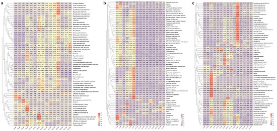 Flavor chemical analysis of the fermented grains from rounds 1b, 2, and 3 during the sauce-flavor Baijiu manufacturing process. (a), round 1b. (b), round 2. (c) round 3.