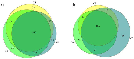 Venn charts can be used to analyze the common and unique microorganisms based on Operational Taxonomical Units (OTUs) in multiple groups or samples and can show the similarity and divergence of microbial compositions in samples [24]. Results showed that bacteria from the CS (Caosha, round 1b) samples included 229 microbial genera, bacteria from the C2 (round 2) sample included 235 microbial genera, and bacteria from the C3 (round 3) sample included 205 microbial genera (Figure 3a). These samples shared 160 bacterial genera, and CS samples contained 23 unique bacterial genera, C2 samples included 25 unique bacterial genera, and C3 samples contained 15 unique bacterial microbial genera. The diversity of fungi was slightly lower than that of bacteria (Figure 3b). CS samples included 141 fungal genera, C2 samples contained 169 fungal genera, and C3 samples included 209 fungal genera. These three groups of samples shared 106 genera, while CS samples contained 7 unique fungal genera, C2 samples included 22 unique fungal genera, and C3 samples contained 60 unique fungal genera (Figure 3b).