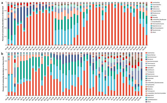 PLS-DA is a multivariate statistical analysis method used for discriminant analysis, which shows good sample differentiation performance based on observed or measured variable values [13]. PLS-DA results of bacteria and fungi further confirmed the PCoA results. Bacterial PLS-DA results showed that the samples were located in different phase limits with clear discrimination at the beginning of fermentation, indicating that bacteria from environmental systems had a significant impact on the bacterial composition and abundance when starting fermentation (Figure 6a). During fermentation, the distance between sample points became shorter (Figure 6a), indicating that although the fermentation rounds were different, bacteria that played a major role in the fermentation process were similar and gradually became the dominant genera in abundance. Fungal PLS-DA results were also consistent with those of PCoA. At the beginning of fermentation, there was no obvious difference between rounds 2 and 3 (Figure 6b), indicating that the fungal microorganisms in Daqu had an important influence on the microbial composition [25]. During fermentation, the succession of the fungal community showed a similar convergence phenomenon to that of bacteria.